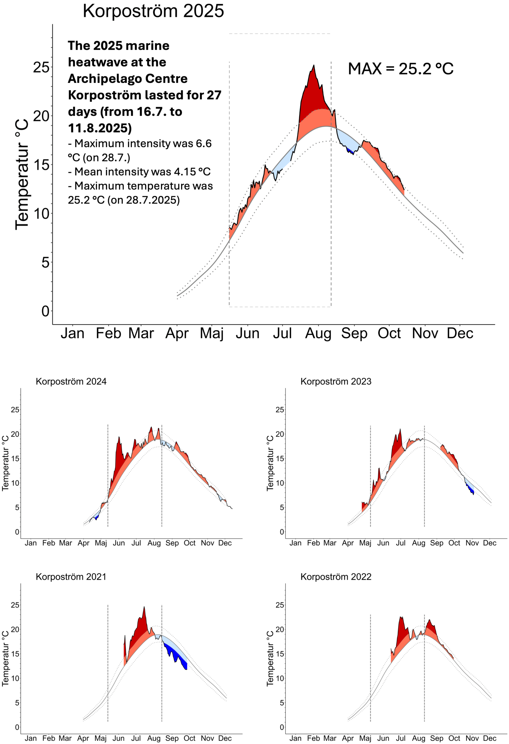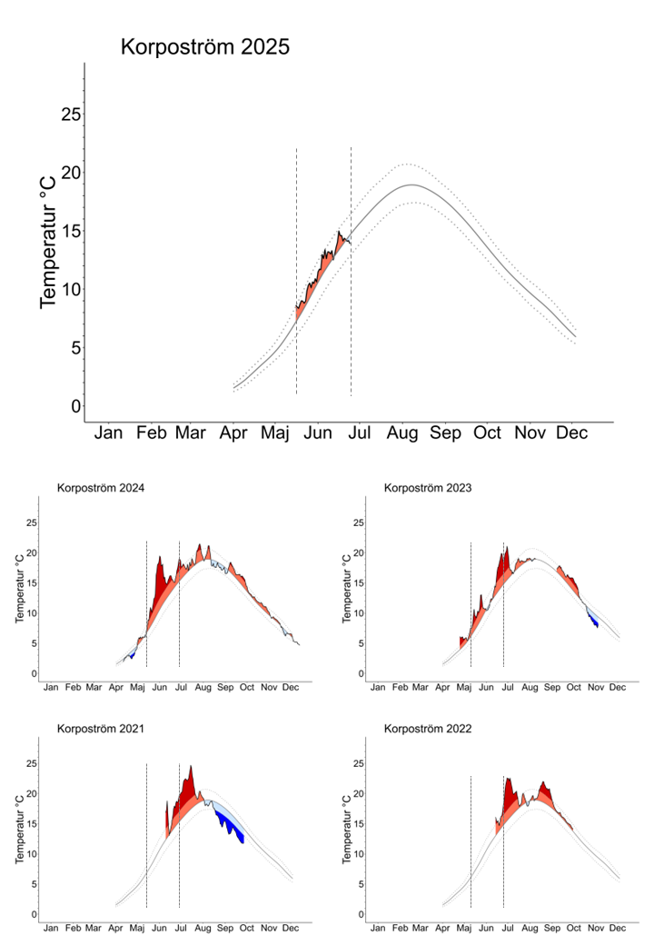 To help you compare this year with previous ones, we’ve also included temperature curves from the past four years, measured at Skärgårdscentrum Korpoström.